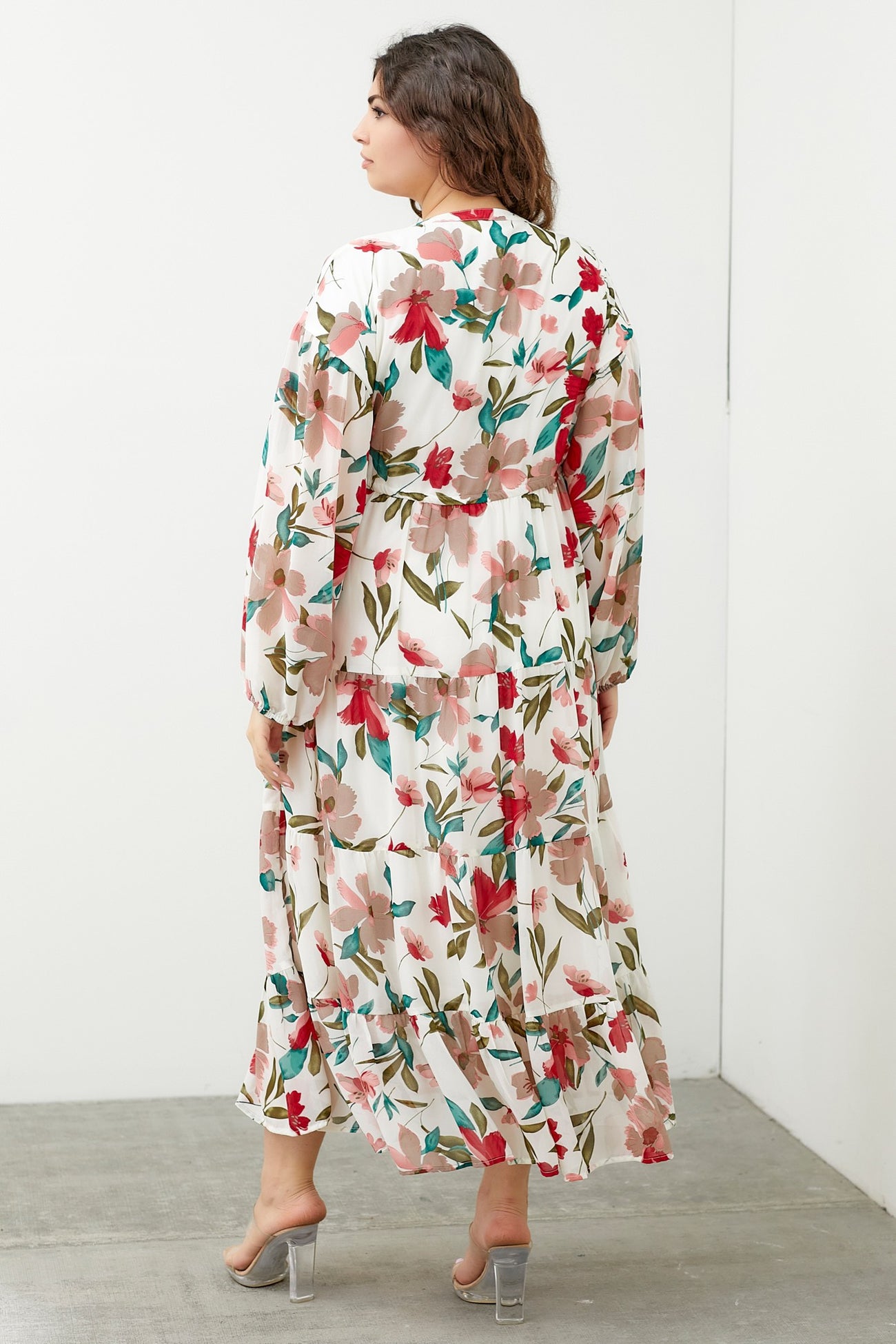 Details A floral plus size midi dress featuring a v-neckline, front functioning buttons, long sleeves, a drawstring waist tie, and a tiered skirt. Content + Care