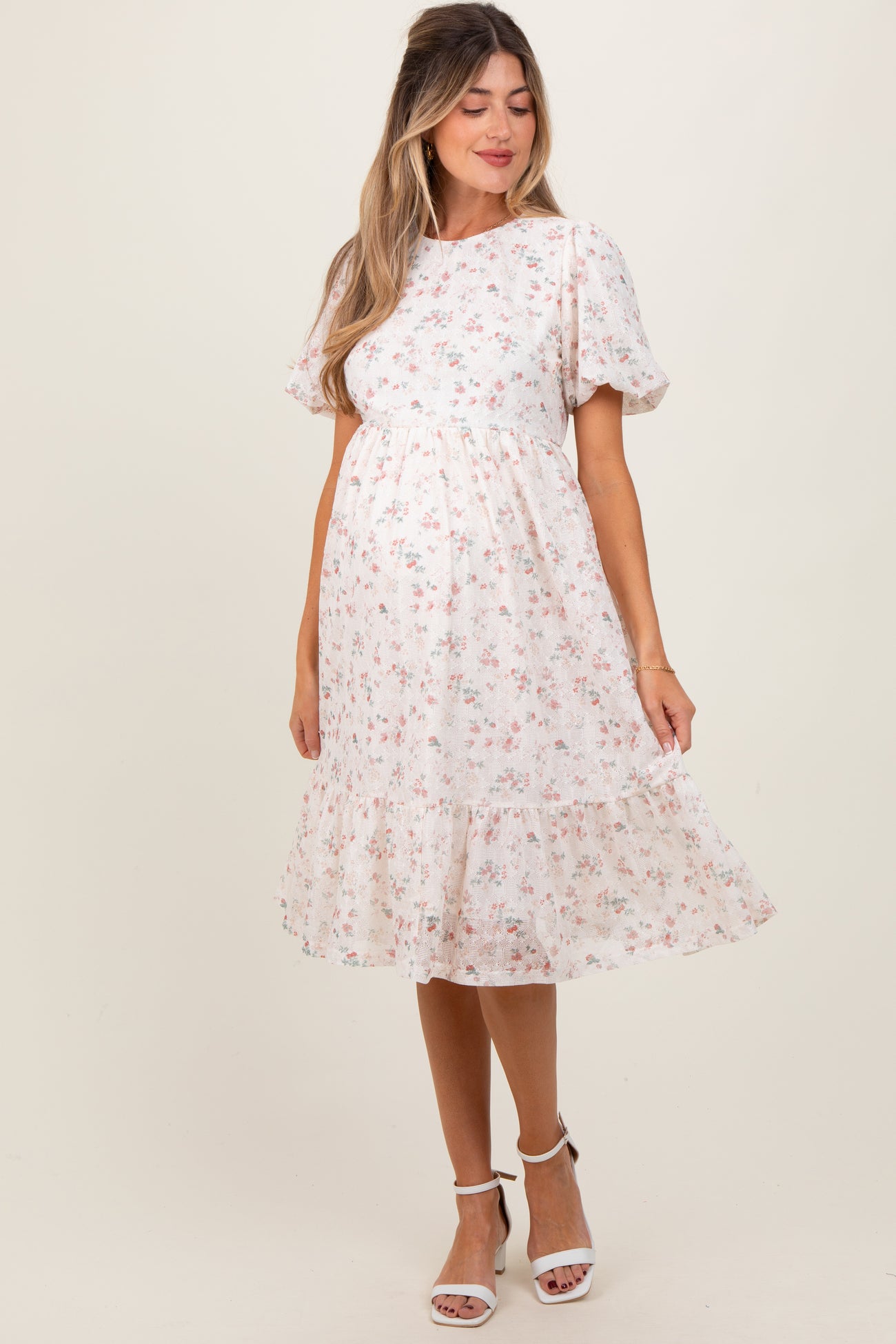Ivory Floral Lace Ruffle Maternity Midi Dress