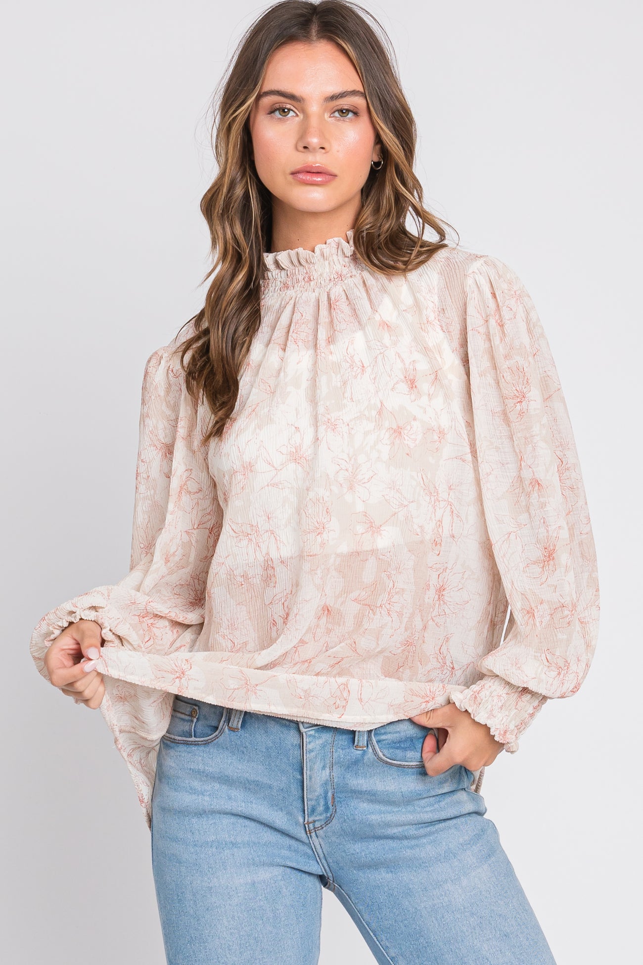 A plisse, floral maternity top featuring a smocked ruffle accent mock neck, long sleeves with smocked cuffs, and a back keyhole. Top is semi sheer.