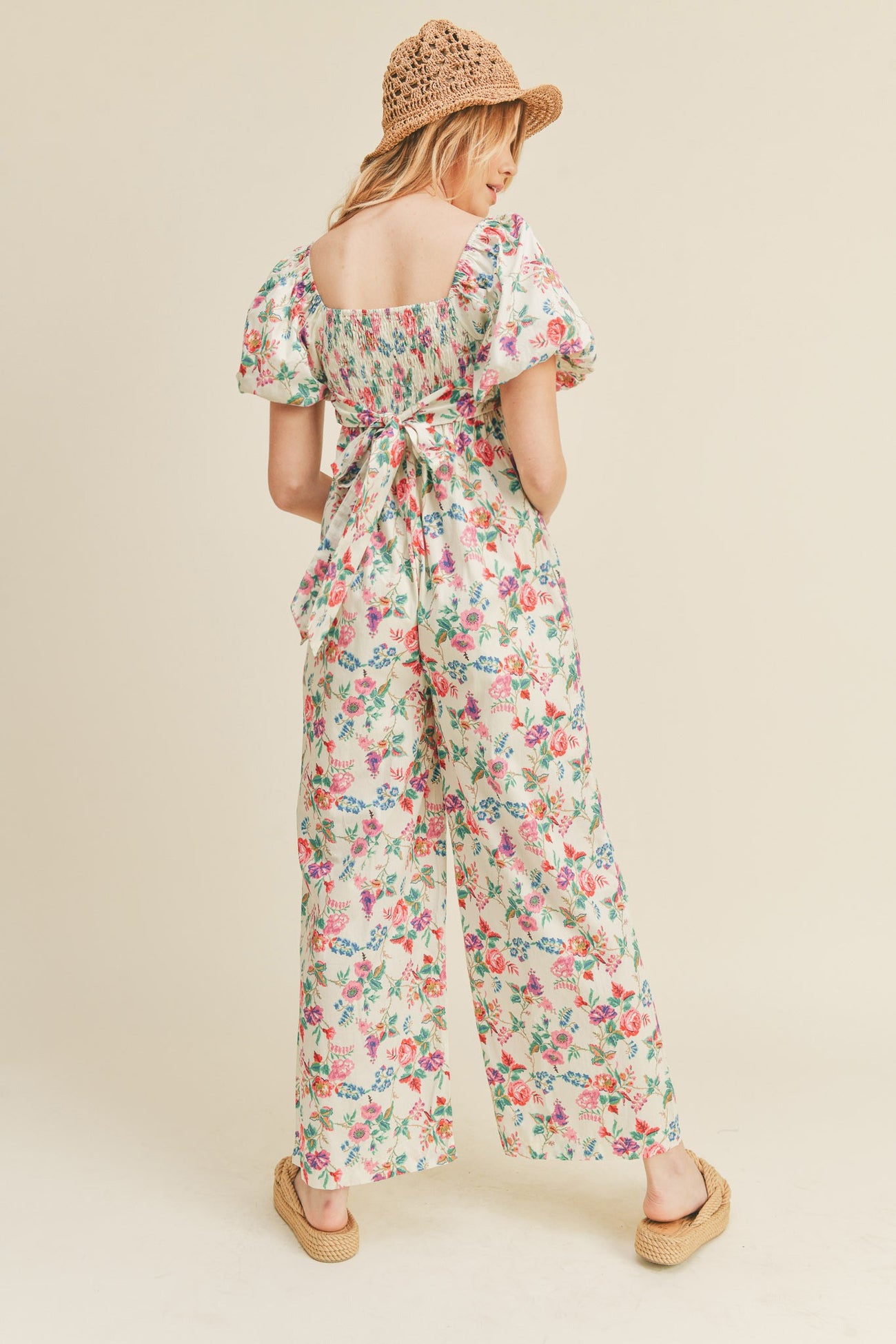 Ivory Floral Wide Leg Puff Sleeve Jumpsuit
