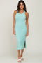 A solid ribbed sleeveless midi dress with a round neckline and two side slits.