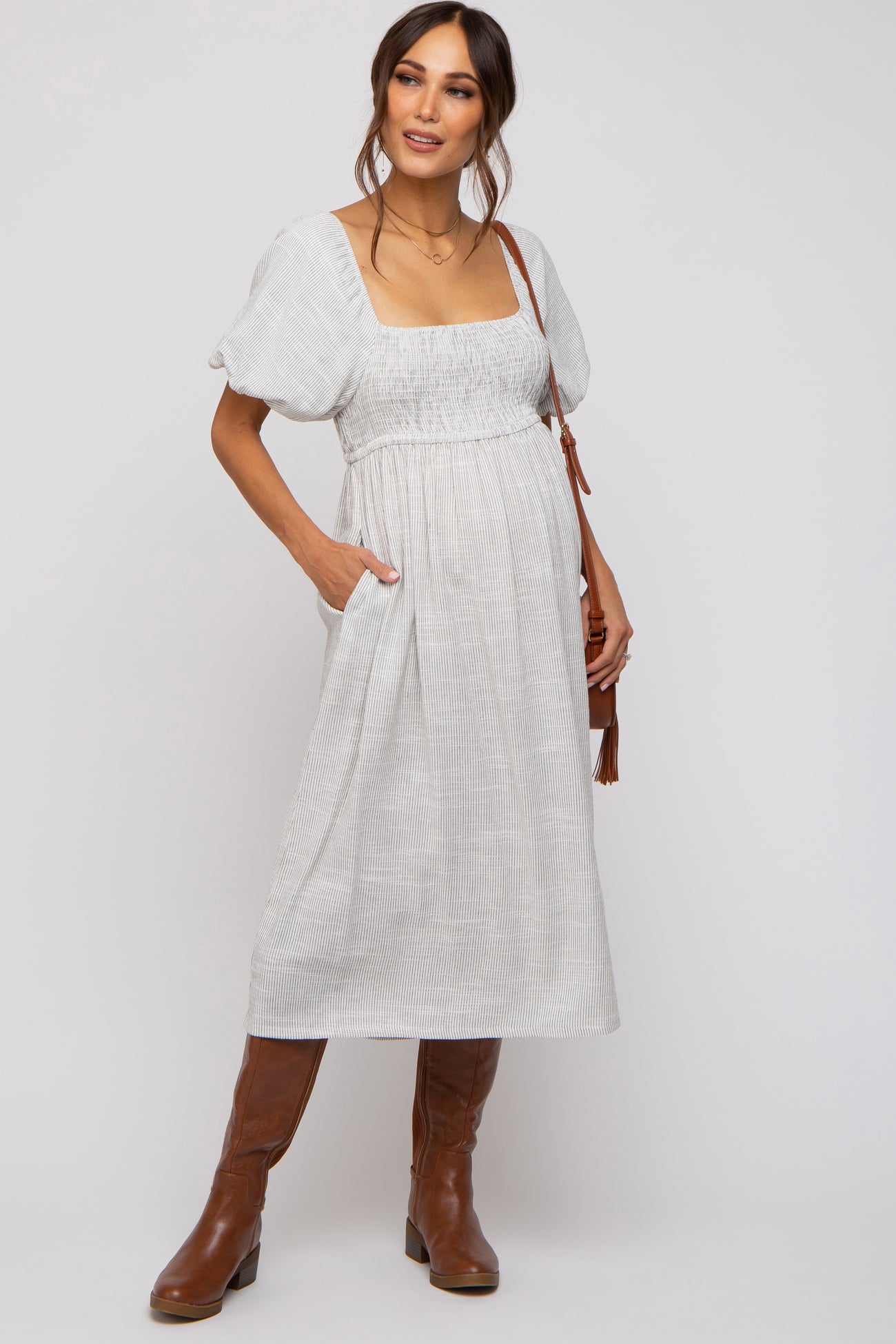 Ivory Striped Linen Smocked Short Puff Sleeve Maternity Midi Dress