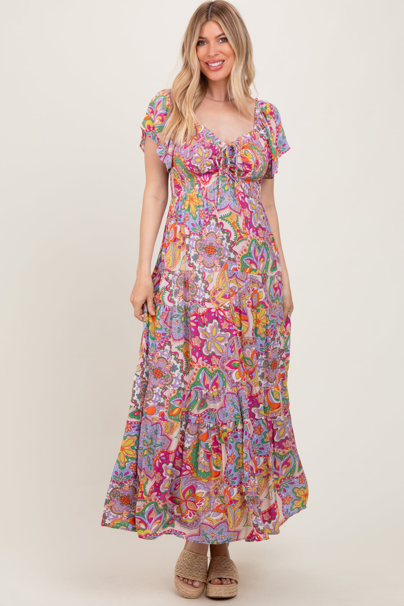Lavender Floral Paisley Smocked Tiered Maxi Dress