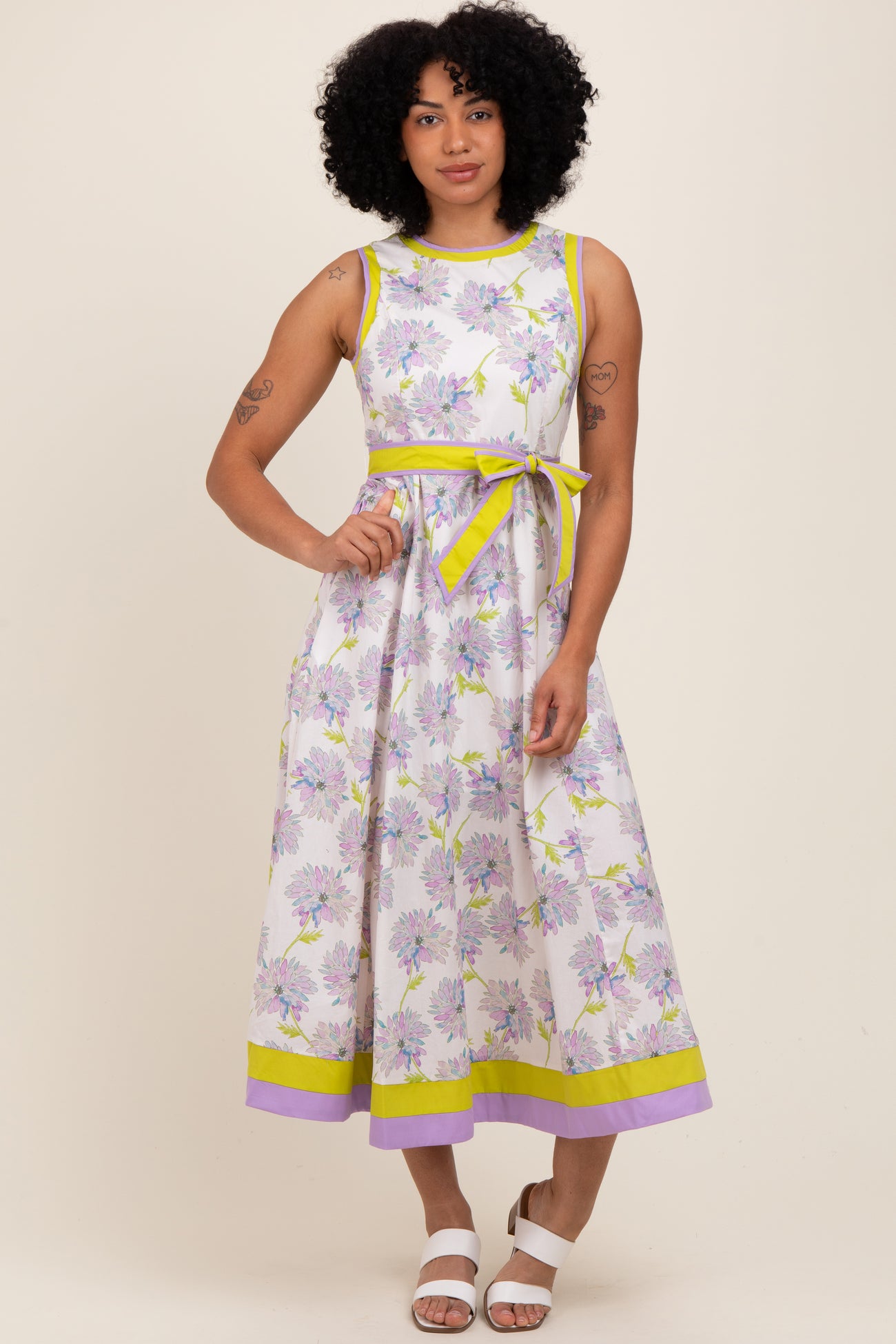 Lavender Floral Sleeveless Sash Tie Maternity Midi Dress