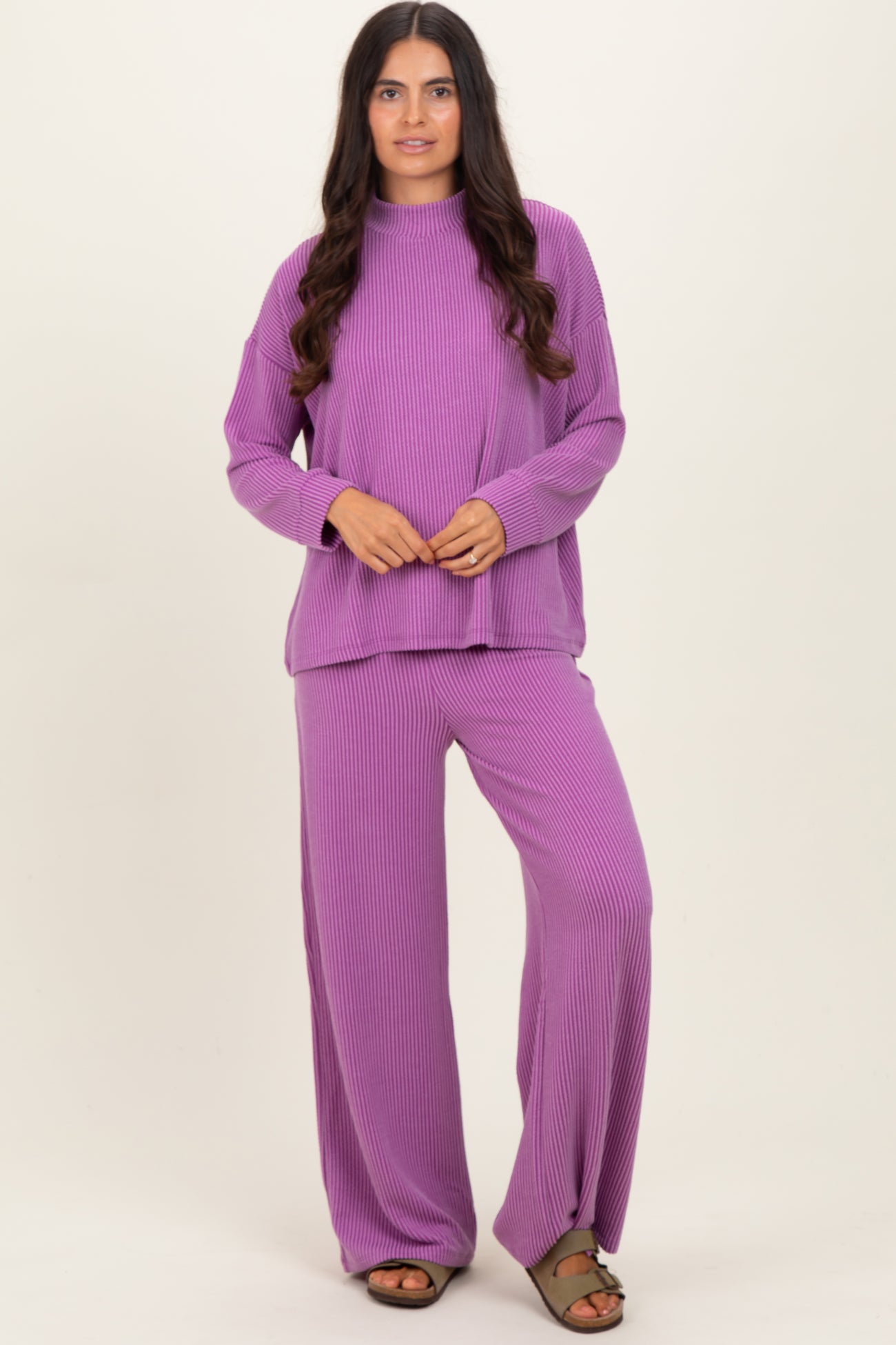 Elevate your loungewear with this Lavender Textured Rib Mock Neck Long Sleeve Pants Set. Crafted from soft, ribbed fabric, this set offers both comfort and style. The mock neck top features long sleeves and a relaxed fit, perfect for cozy days at home or casual outings. Paired with matching wide-leg pants for a flattering, laid-back silhouette, this set is effortlessly chic in a calming lavender hue. Ideal for lounging, running errands, or a casual coffee date, this ensemble blends comfort with a trendy look. Easy to dress up or down, it’s a versatile addition to your wardrobe.