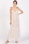 Details A lace overlay maxi dress featuring a v-neckline, satin shoulder ties, a tiered skirt and double lining. Content + Care