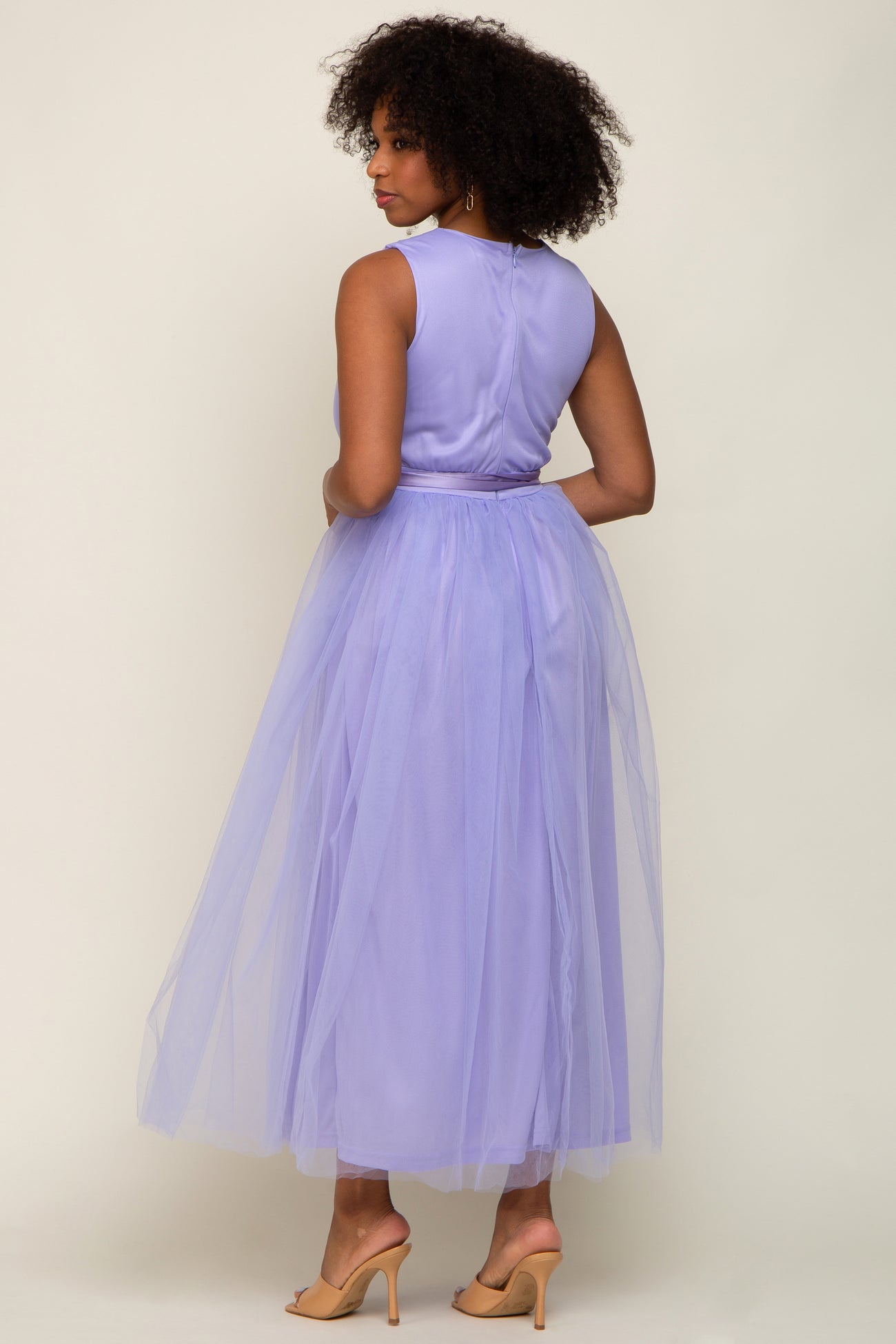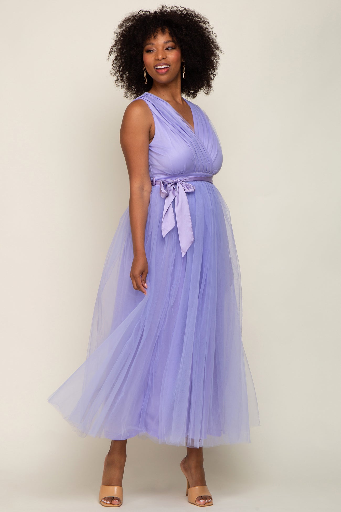 Lavender Wrap V-Neck Waist Tie Tulle Midi Dress
