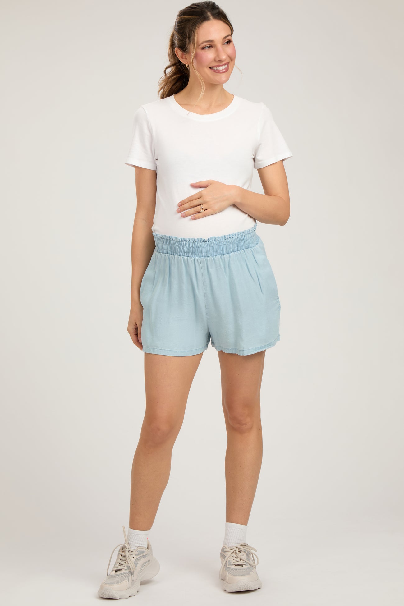 A pair of maternity shorts with an elastic waistband and two side pockets.