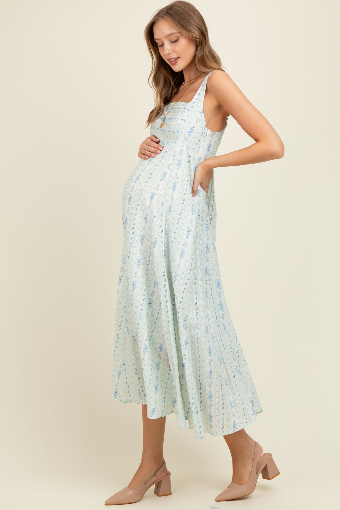Light Blue Cotton Floral Square Neck Sleeveless Maternity Maxi Dress