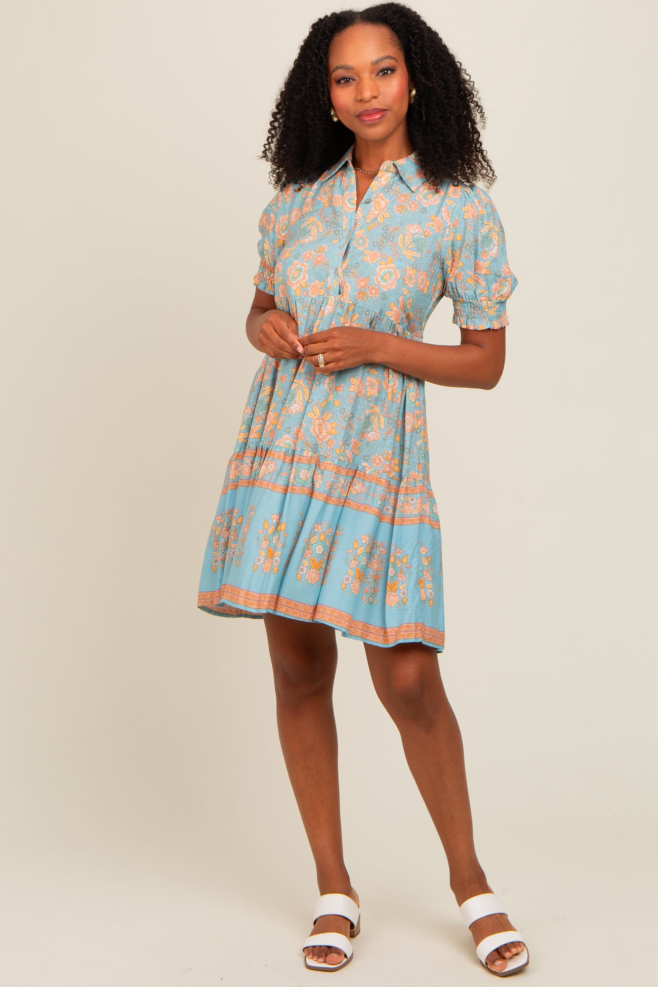 Light Blue Floral Button Up Ruffle Hem Maternity Dress