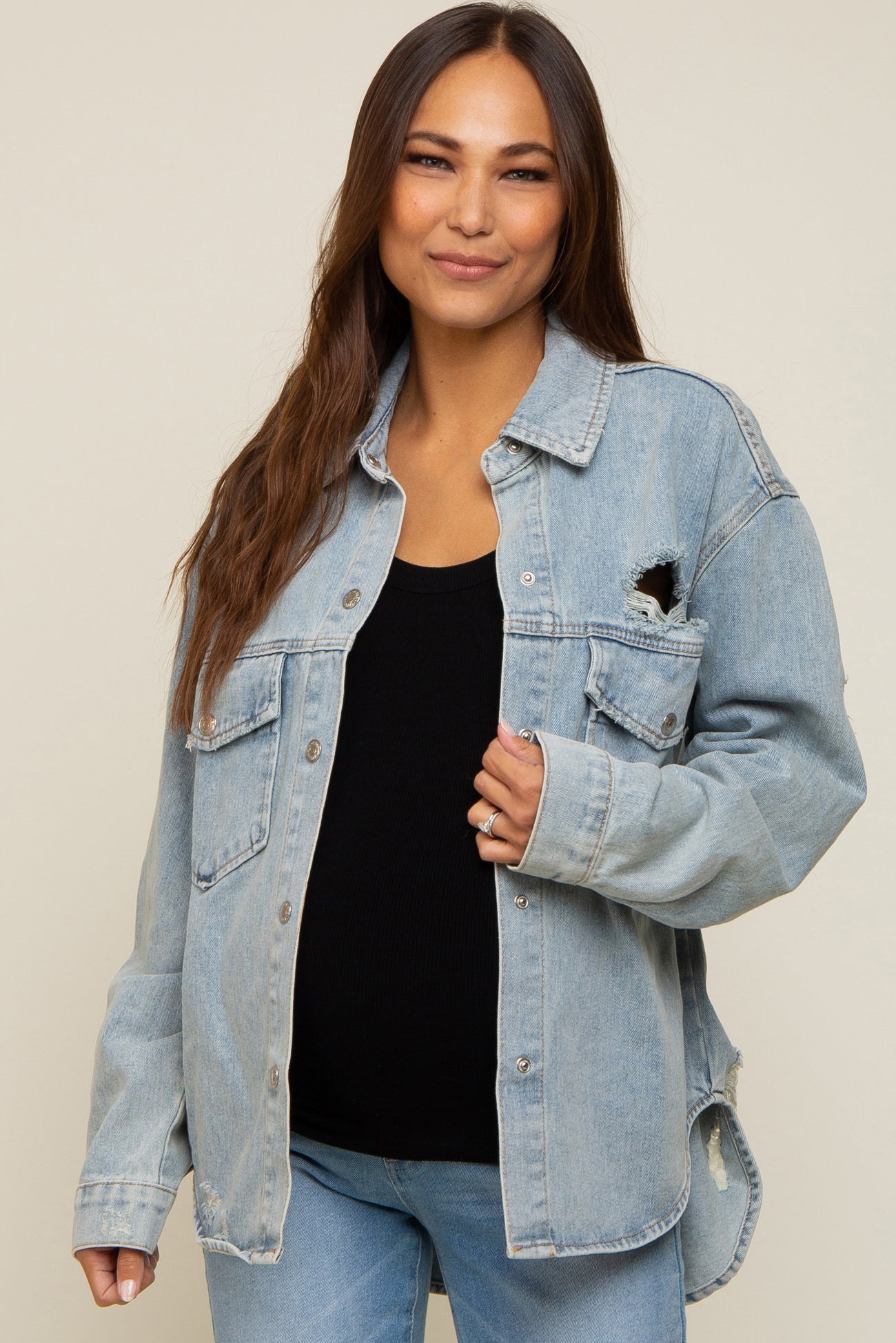A denim maternity shacket with a collar, front snap buttons, two front pockets, long cuffed sleeves, and a hi-lo curved hem. Distresses accents featured throughout.