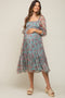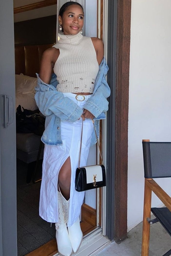 A denim shacket with a collar, front snap buttons, two front pockets, long cuffed sleeves, and a hi-lo curved hem. Distresses accents featured throughout.
