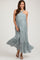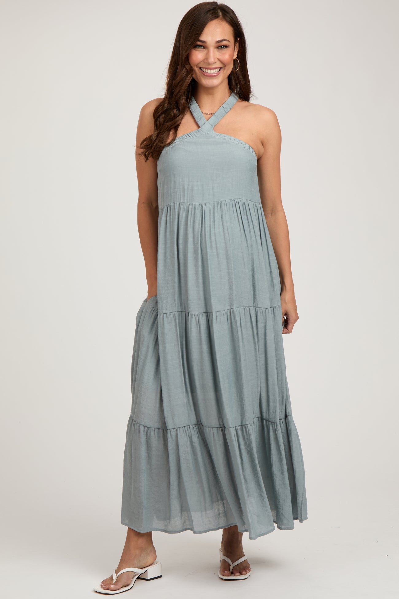 A sleeveless tiered maternity maxi dress featuring a halter neckline, a side slit and double lining.