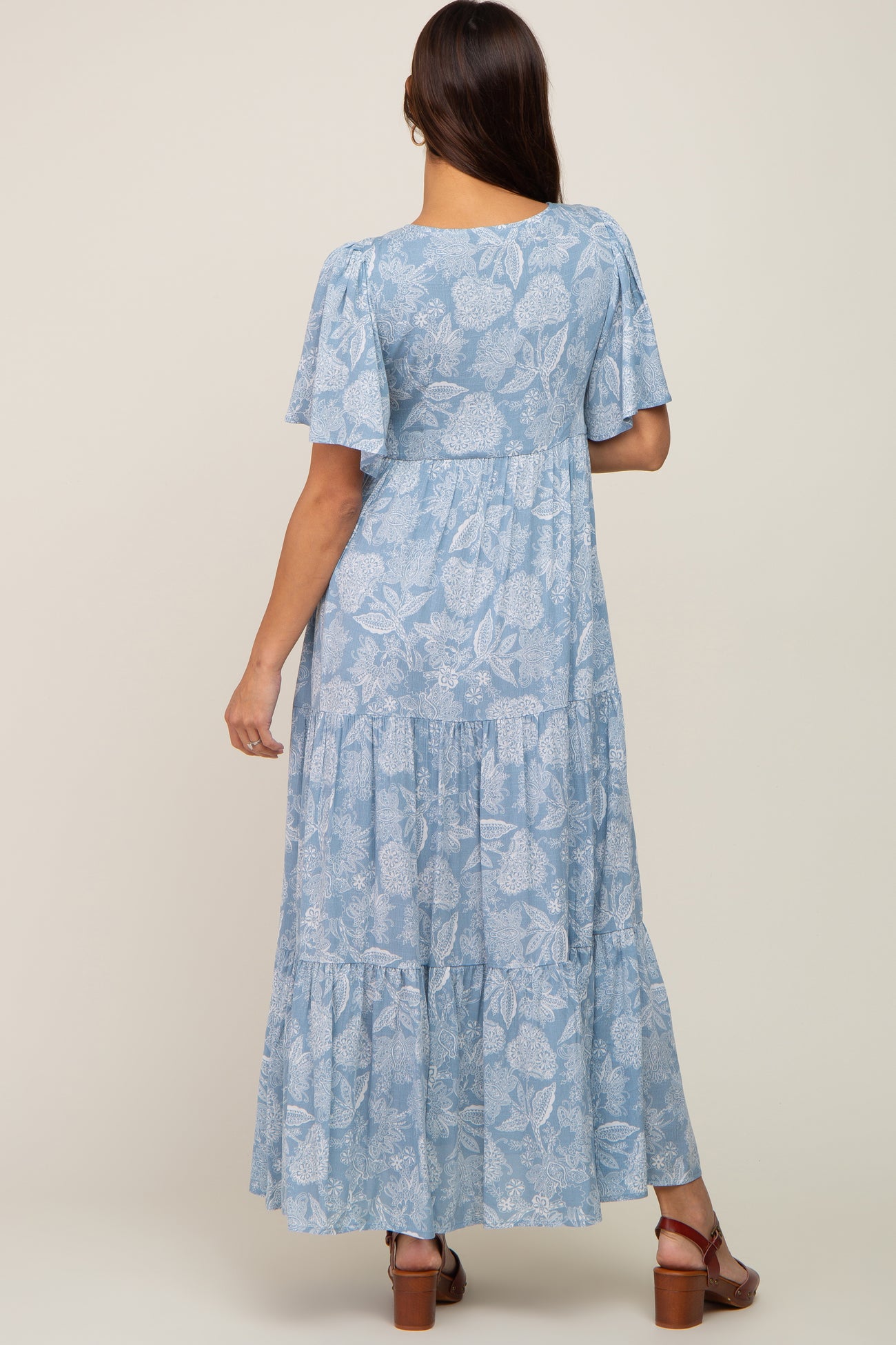 Light Blue Paisley Button Down Tiered Maternity Maxi Dress