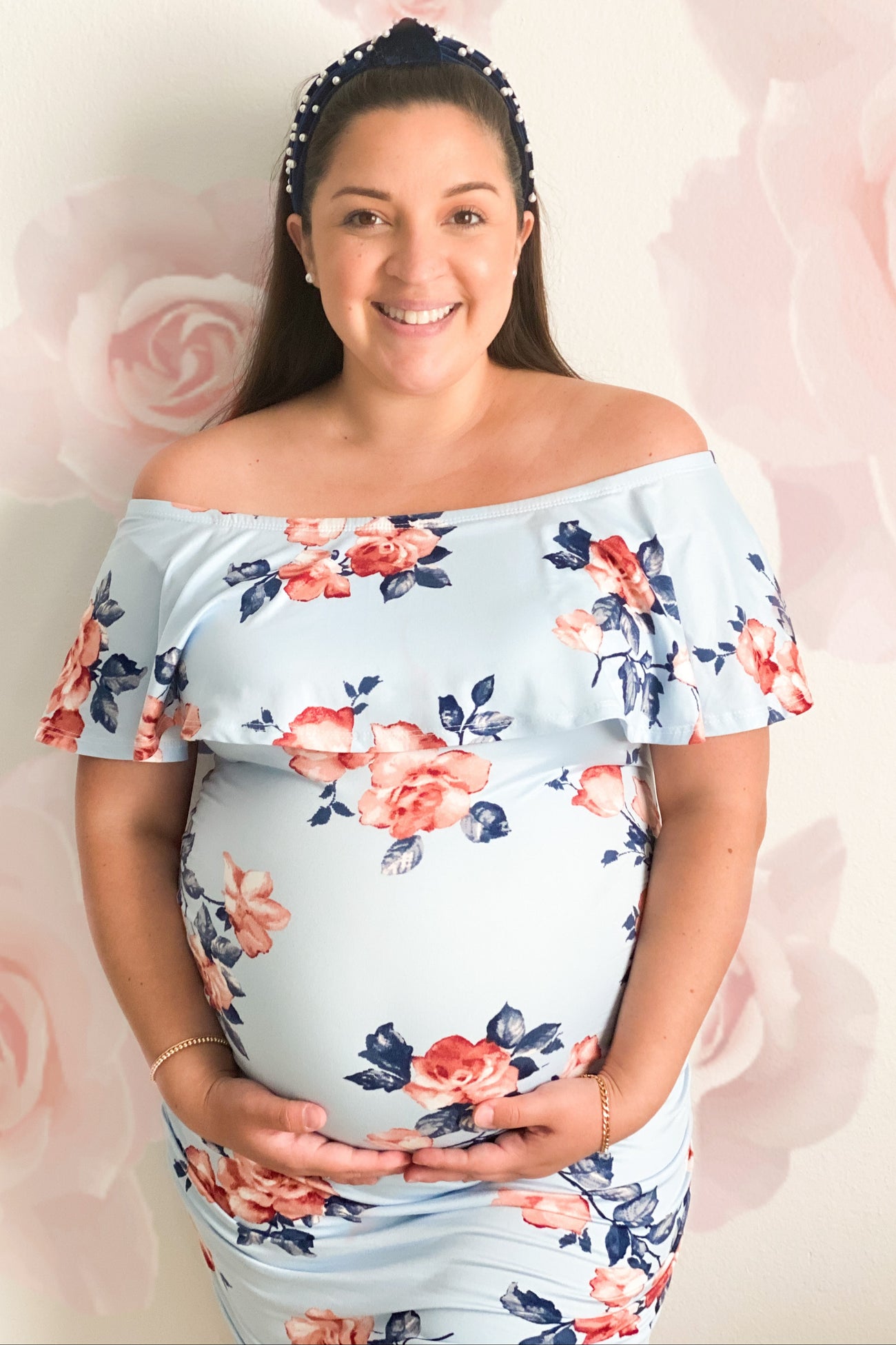 A rose print maternity dress featuring ruched sides for a fitted style and a cinched elastic neckline with a ruffle trim.