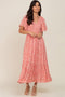 A maternity midi dress featuring a rounded neckline, a smocked elastic top, layered ruffle flutter sleeves and a ruffle hem.