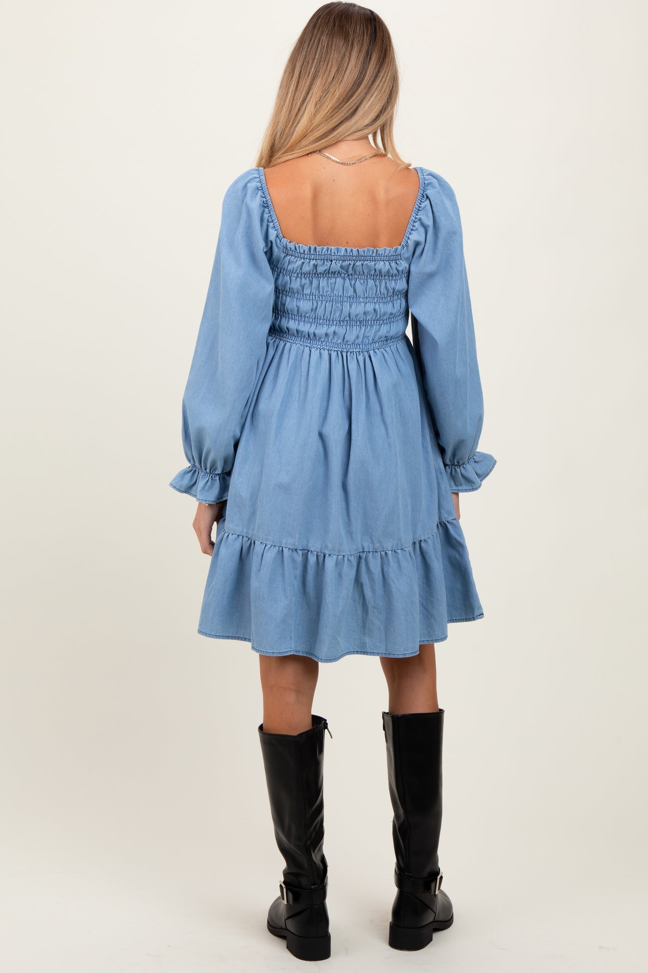 Light Blue Vintage Wash Chambray Smocked Maternity Midi Dress