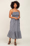 A striped, solid hue maternity midi dress featuring a squared neckline, 3/4 cinched sleeves, a partially smocked back, and a tiered hem.