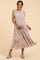 A floral maternity midi dress with flounce cap sleeves, ruffle accent mock neck, a back keyhole button closure, an elastic waistband, side pockets, and a tiered skirt. dress is lined 3/4 of the way down.