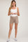 A pair of soft knit maternity lounge shorts featuring a smocked elastic waistband and a lettuce edge hem.