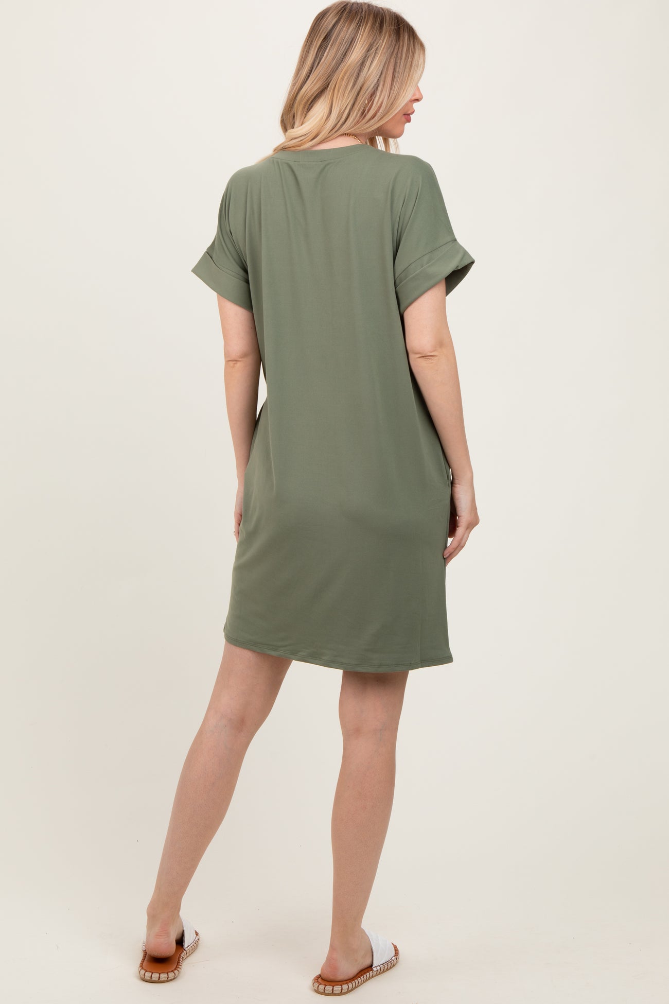 Light Olive Brushed Rolled Short Sleeve V-Neck Dress