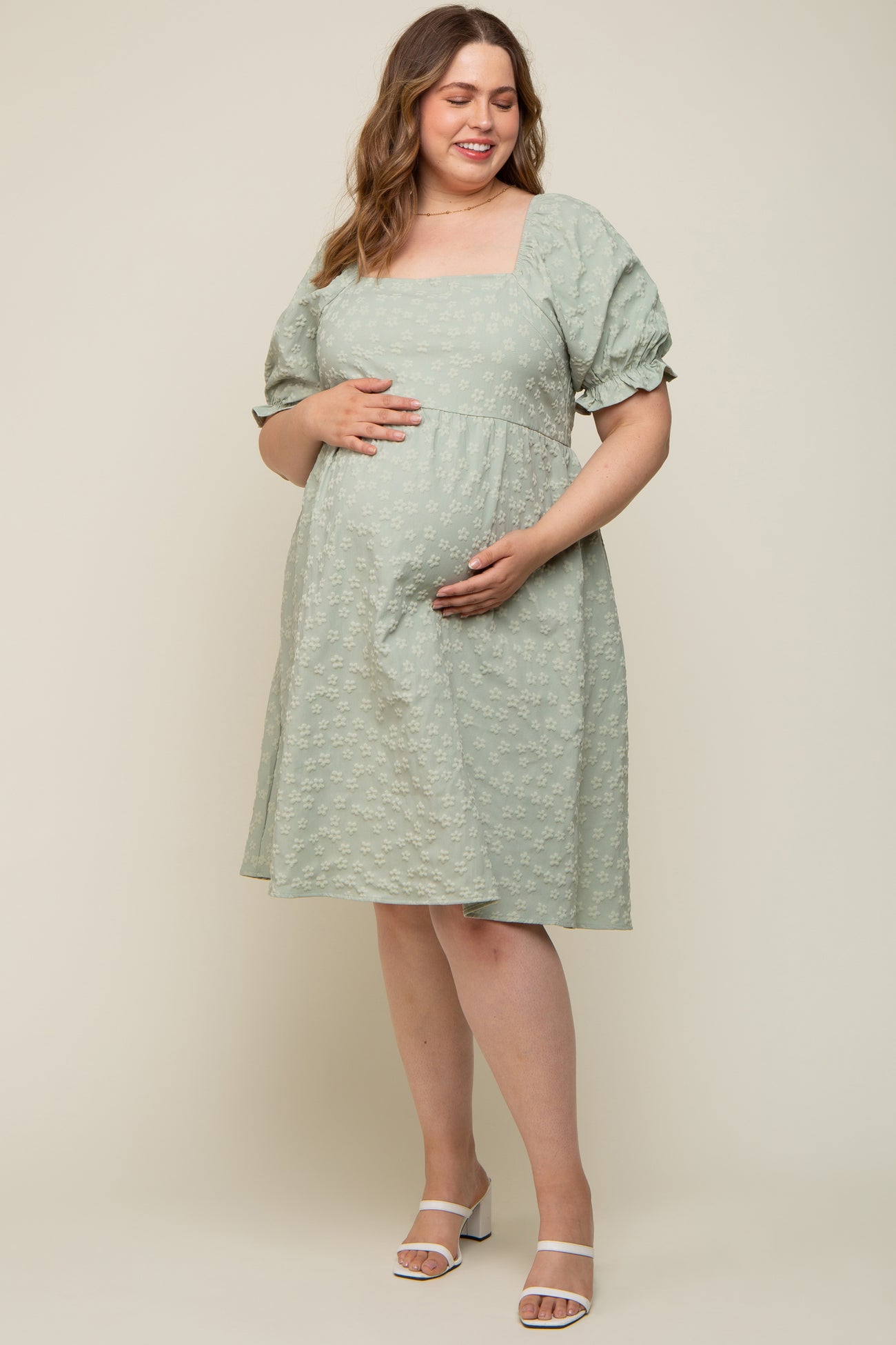 Light Olive Floral Textured Square Neck Babydoll Maternity Plus Dress