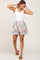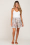 A pair of palm print shorts featuring an elastic waistband, a front tie accent and side pockets.