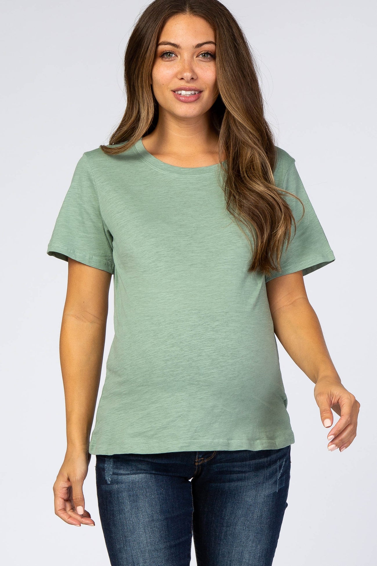 A solid hued maternity knit top featuring short sleeves and a rounded neckline.