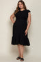 Details A plus size midi dress featuring a rounded neckline, a smocked elastic top, layered ruffle flutter sleeves and a ruffle hem. Content + Care