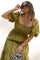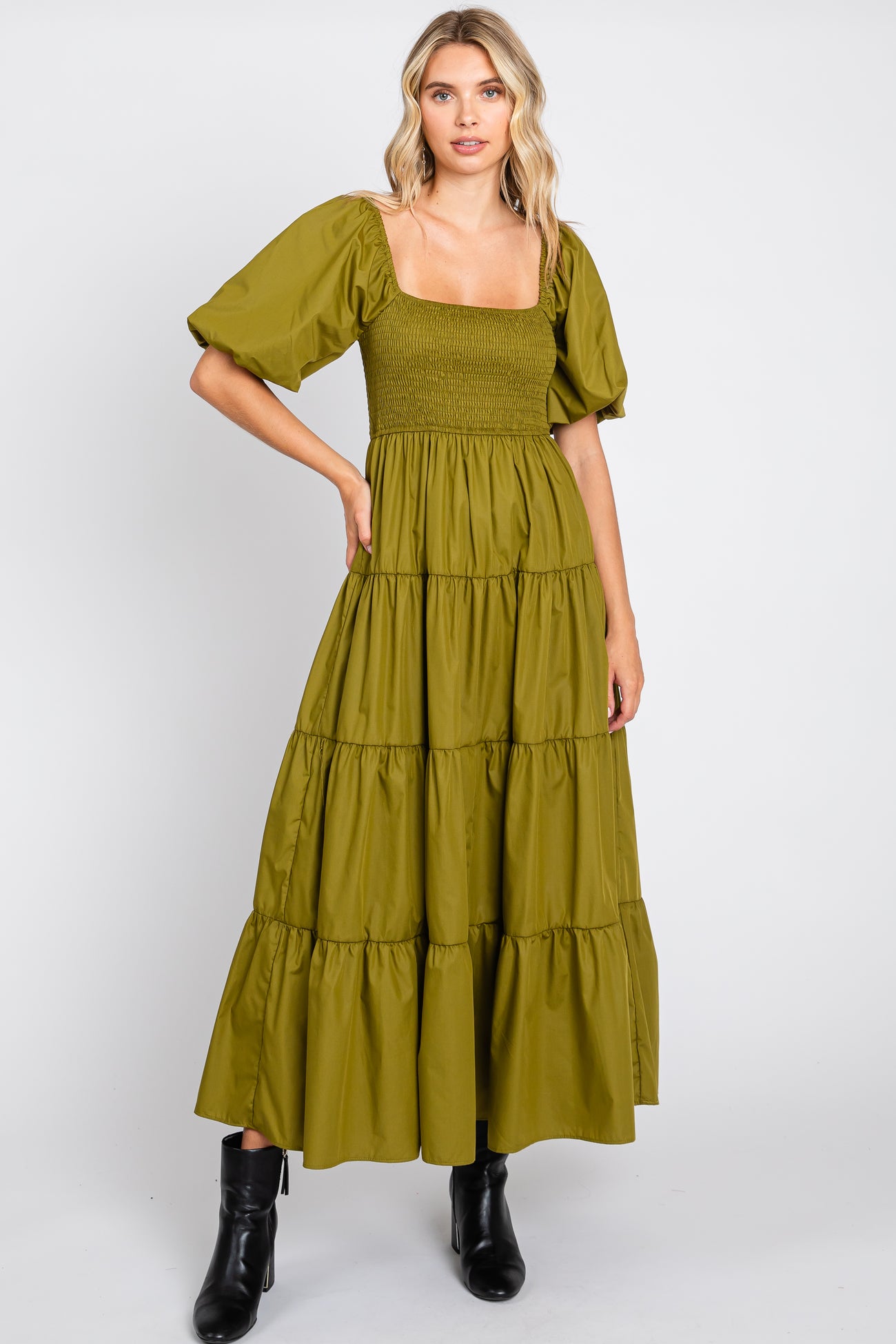 Light Olive Square Neck Smocked Puff Short Sleeve Tiered Midi Dress