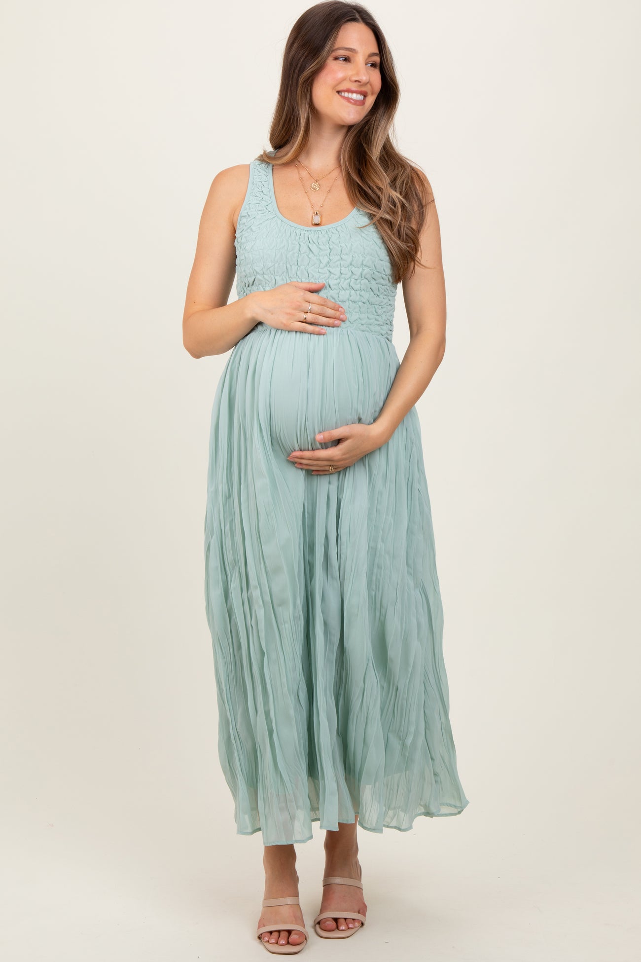 Light Olive Textured Smocked Bodice Sleeveless Maternity Maxi Dress