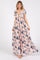 A floral maxi dress featuring a deep v-neckline, short puff sleeves, a back tie closure, a back cutout, and elastic under the bust. Dress is fully line.