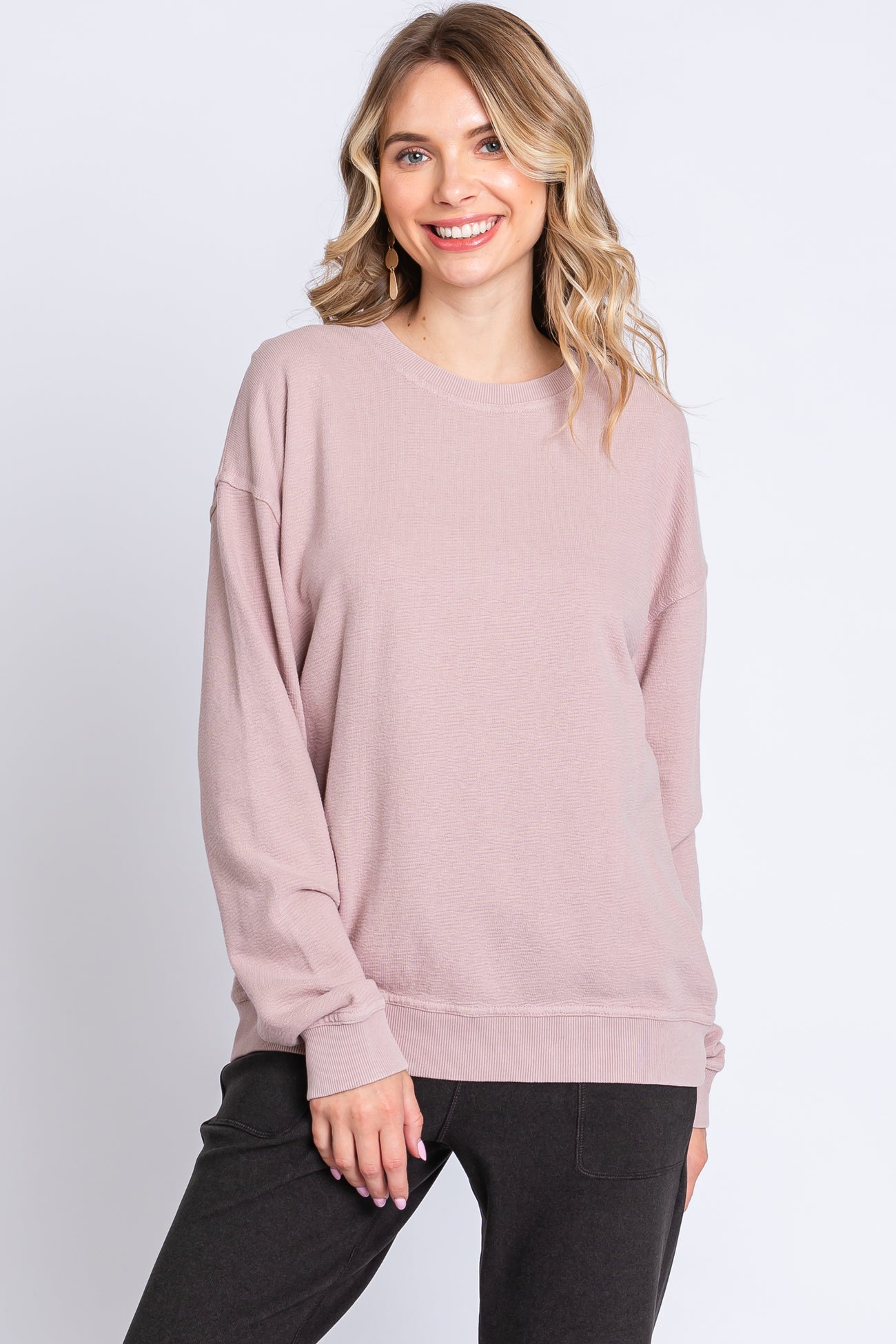 A knit maternity top featuring a crew neckline, long sleeves and a ribbed trim.
