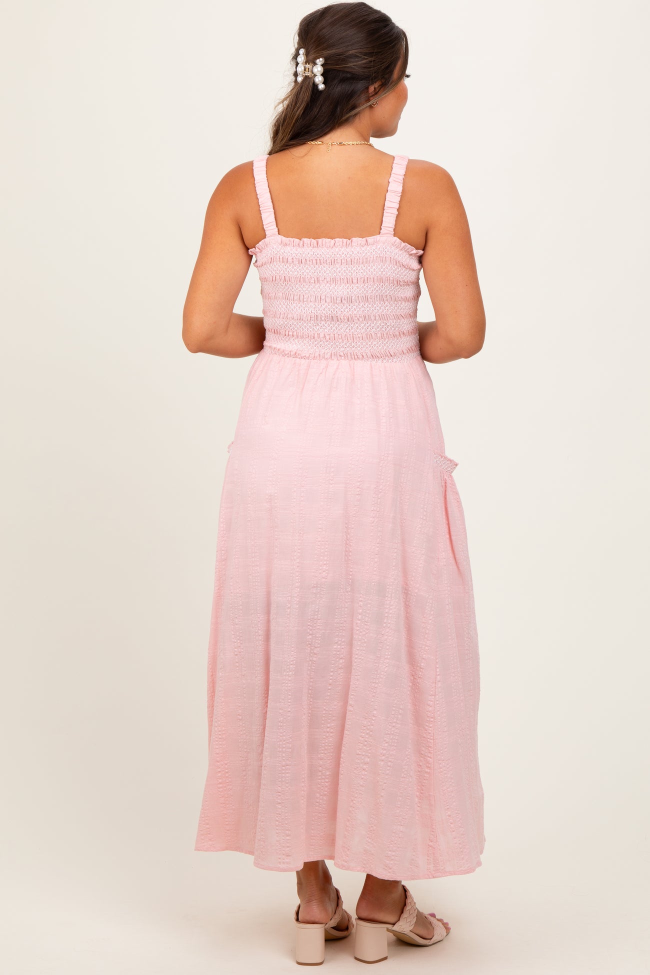 Light Pink Smocked Embroidered Bust Textured Maternity Midi Dress