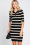 A striped trim dress with a smocked top, layered flounce sleeves, a ruffle accent at the waist, and a gathered bottom tier. Sleeves can be worn on or off the shoulder.