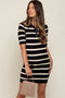 A striped trim maternity dress with a smocked top, layered flounce sleeves, a ruffle accent at the waist, and a gathered bottom tier. Sleeves can be worn on or off the shoulder.