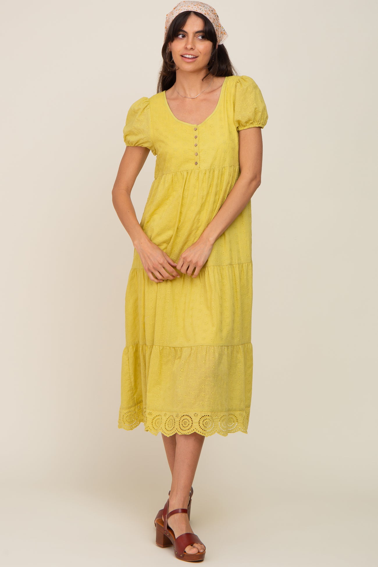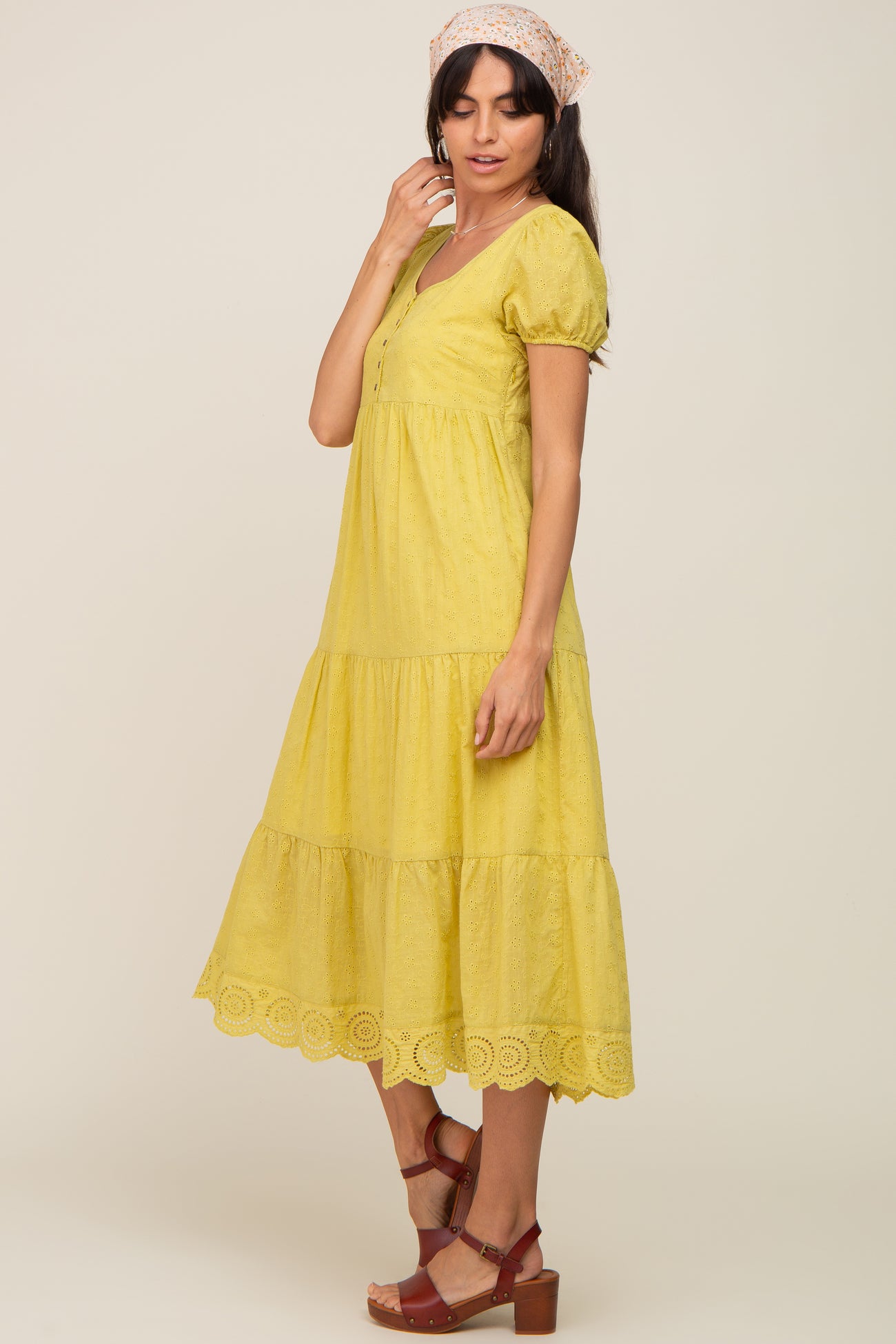 Lime Eyelet Button Front Tiered Scalloped Hem Midi Dress