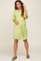 A shiny pleated dress featuring a collared neckline, a button front, a belted adjustable tie at the waist and short sleeves.