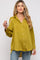 A striped maternity top with a collar, front functioning buttons, long drop shoulder sleeves, and a curved hi-lo hem.
