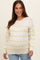 A striped knit maternity sweater featuring long sleeves and a rounded neckline.