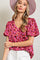 An animal printed blouse featuring a v-neckline, short bubble puff sleeves, and a slight hi-lo hem.