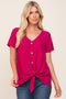 A solid hued maternity top featuring a button accent on front, a tie accent on hemline, a v-neckline, and short sleeves.