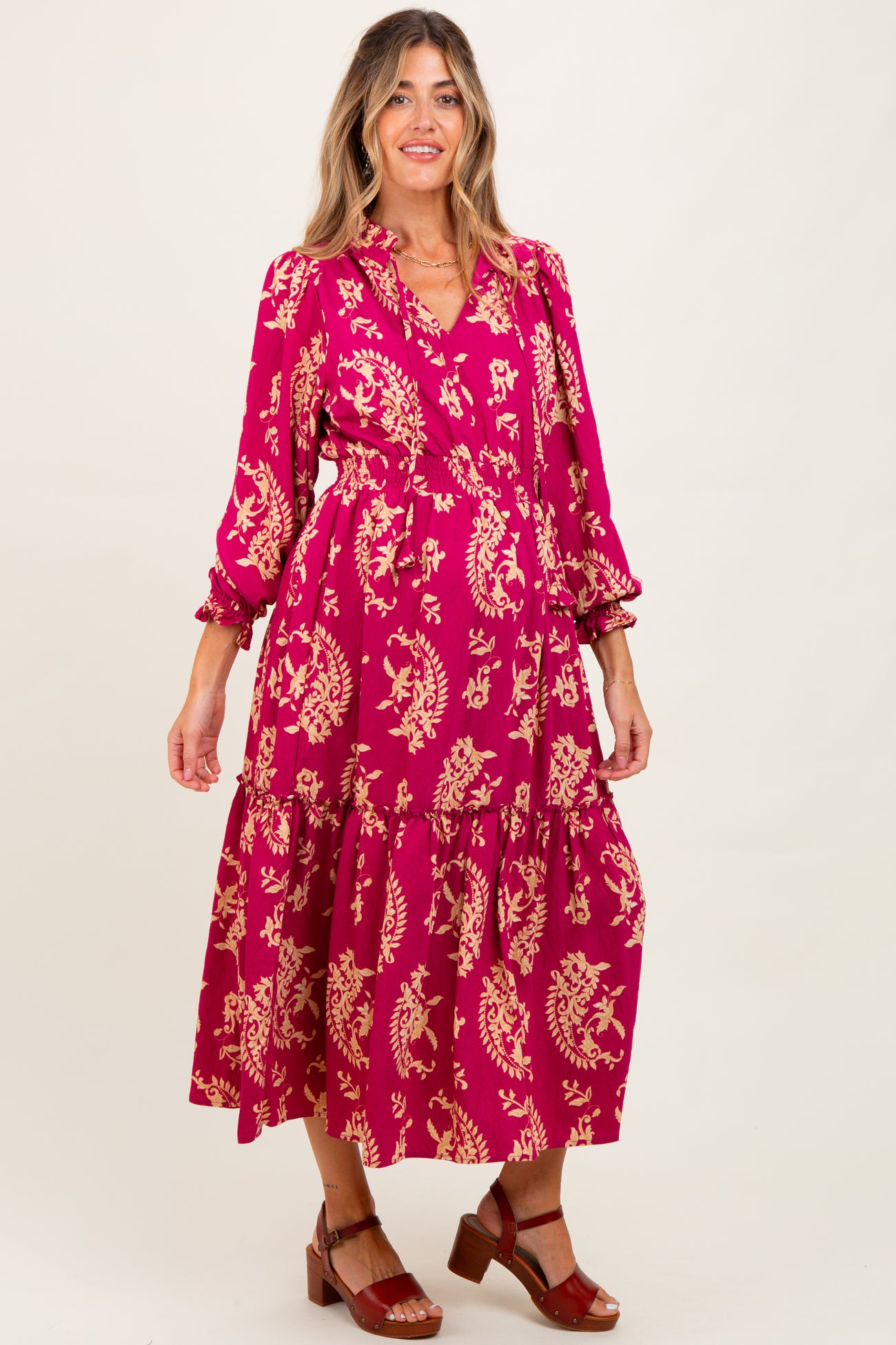 Magenta Damask Front Tie Smocked Waist Maternity Midi Dress