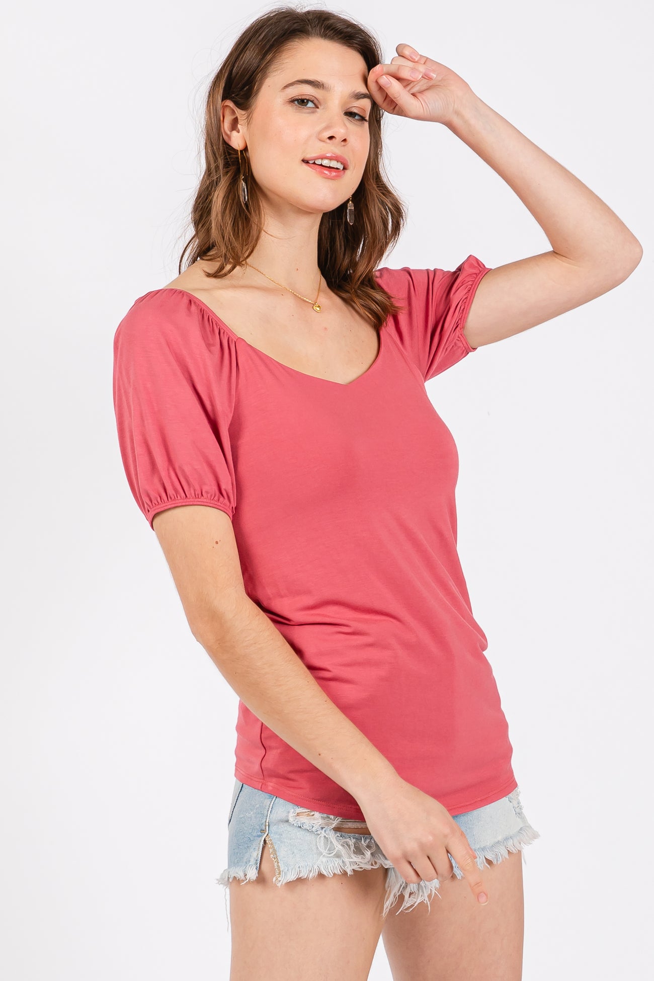 A solid hued top featuring short puff sleeves and a v-neckline.