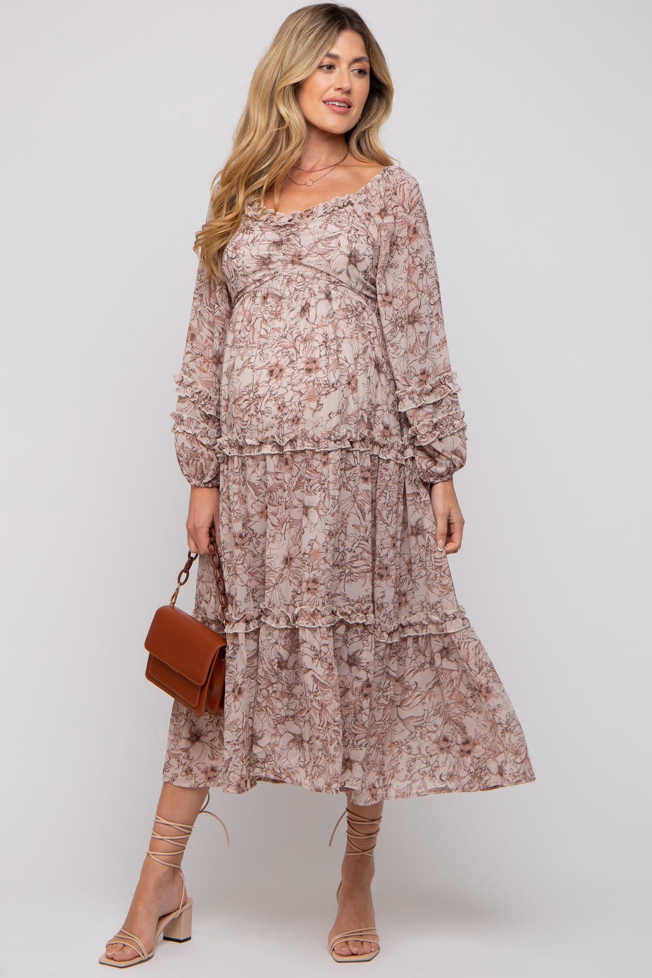 Mauve Floral Chiffon Sweetheart Neck Ruffle Tiered Maternity Midi Dress