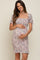A floral maternity mini dress featuring a smocked body, short puff sleeves ,a ruffle trim and a square neckline. This style runs small.