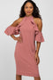 A solid hued, cold shoulder maternity dress featuring a mock neckline, ruffle trim short sleeves, a fitted silhouette, and a keyhole back with a dual button closure.