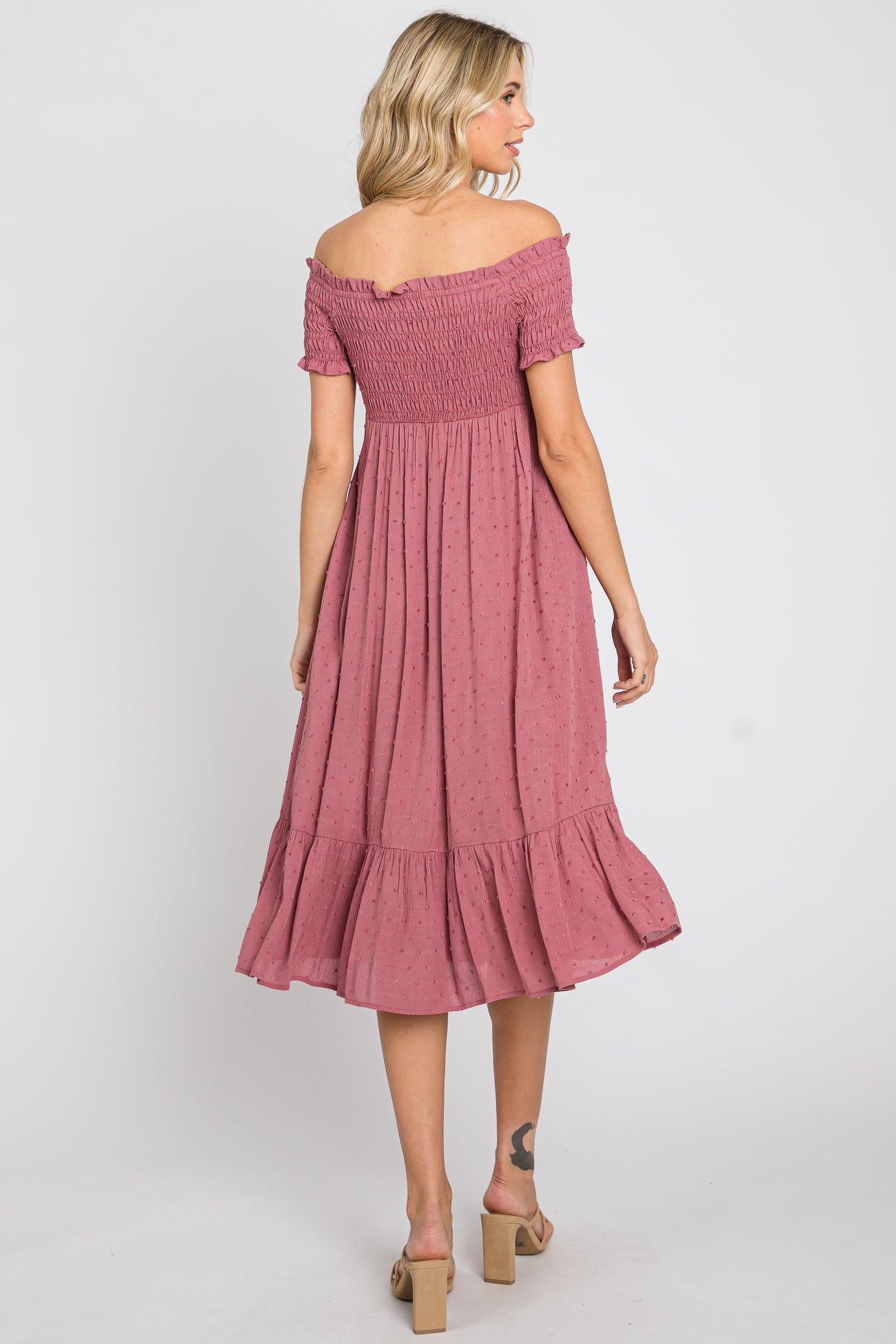 Mauve Off Shoulder Smocked Midi Dress