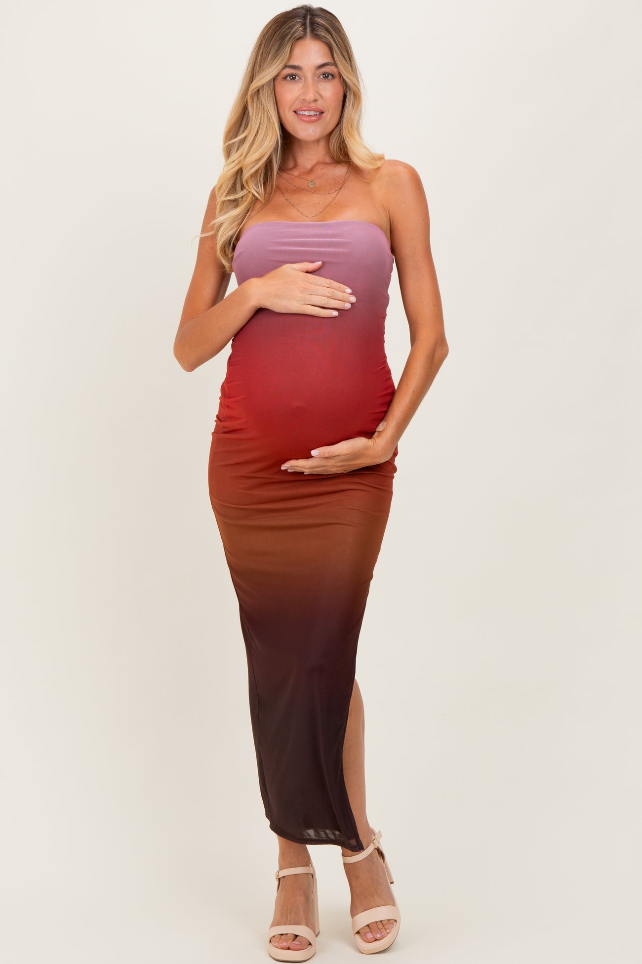 Elevate your maternity wardrobe with our Mauve Ombre Mesh Strapless Maternity Maxi Dress. This stunning dress features a soft, stretchy mesh fabric that gracefully hugs your bump, providing comfort and style throughout your pregnancy. The beautiful ombre gradient moves from mauve to deep brown, creating an eye-catching look perfect for baby showers, maternity photoshoots, or special occasions. Its strapless design and side slit add a touch of elegance, while the ruched sides offer a flattering fit for your changing shape. Pair with heels or sandals for a chic, effortless vibe. Experience maternity fashion that moves with you!