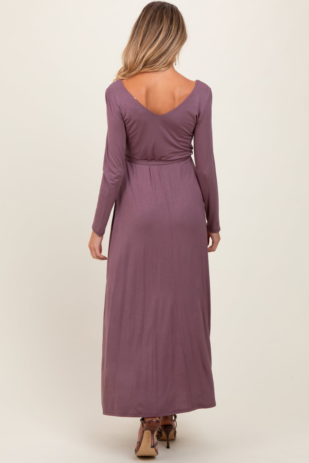 Mauve V-Neck Long Sleeve Sash Tie Maternity Maxi Dress